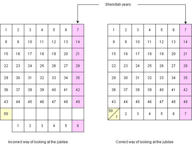 There are 2 views on how to calculate jubilees (shown below). The 1st is a more traditional view which I believe is wrong while the 2nd is what I believe is the correct view. Both start with Leviticus 25:8-13 (NIV) which says to count seven sabbath years (49 years) and in the 50th year is the jubilee.